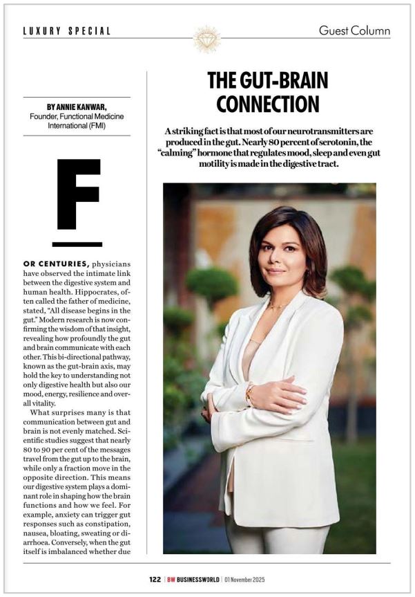 We’re delighted to share that Annie Kanwar, Founder of Functional Medicine International (FMI), contributed a guest column to BW Businessworld (Luxury Special) on “The Gut-Brain Connection.” You can read the original article here: https://www.businessworld.in/article/the-gut-brain-connection-578078 (external link)