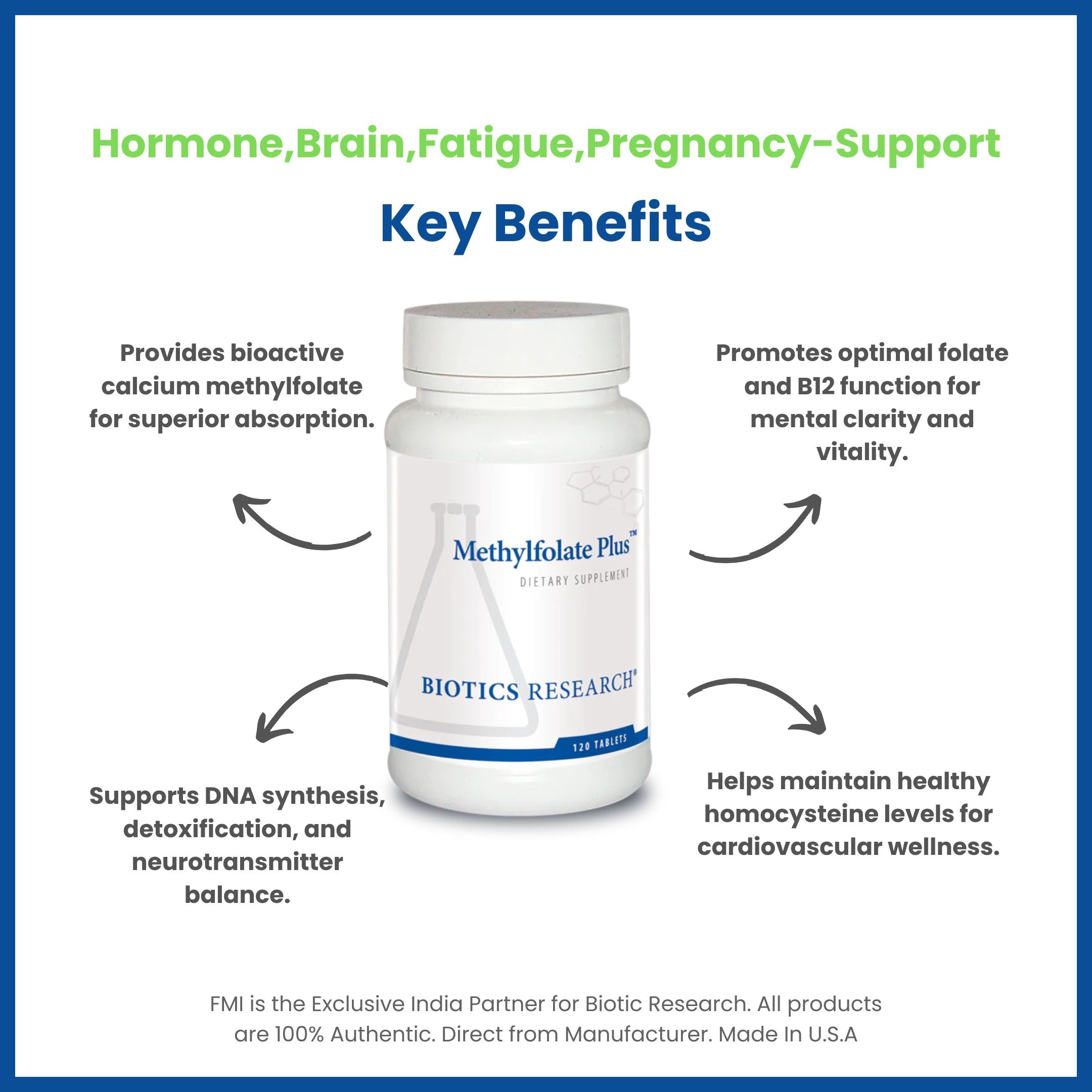 Each serving (½ tablet) of Methylfolate Plus delivers 800 mcg of folate as calcium methylfolate, along with 50 mcg of vitamin B12 as methylcobalamin, all within a biologically active and phytochemically rich vegetable culture base.