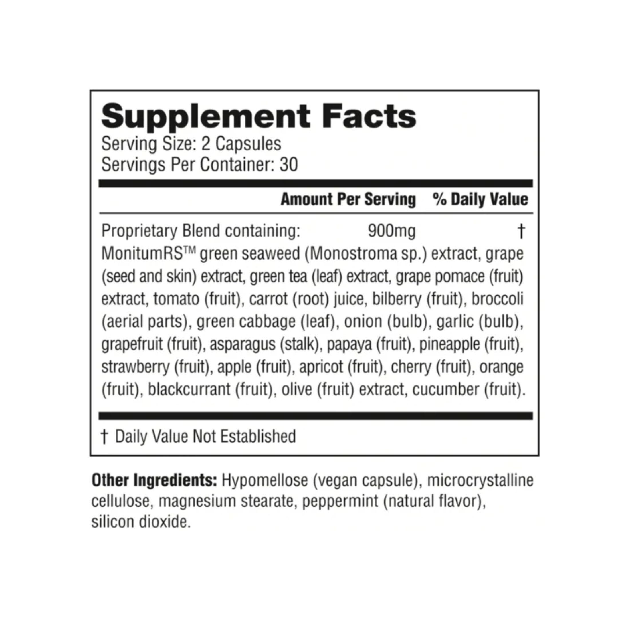 | Proprietary Blend Containing Green seaweed (Monostroma nitidum) extract [MonitumRS™], Grape (seed and skin) extract, Green tea (leaf) extract, Grape pomace (fruit) extract, Tomato (fruit) extract, Kiwi (fruit) juice, Bilberry (fruit), Broccoli (aerial parts), Green cabbage (leaf), Onion (bulb), Carrot (bulb), Grapefruit (fruit), Asparagus (stalk), Papaya (fruit), Pineapple (fruit), Strawberry (fruit), Apple (fruit), Apricot (fruit), Wild cherry (fruit), Mandarin orange (fruit), Blackcurrant (fruit), Olive (fruit) extract, Cucumber (fruit) |