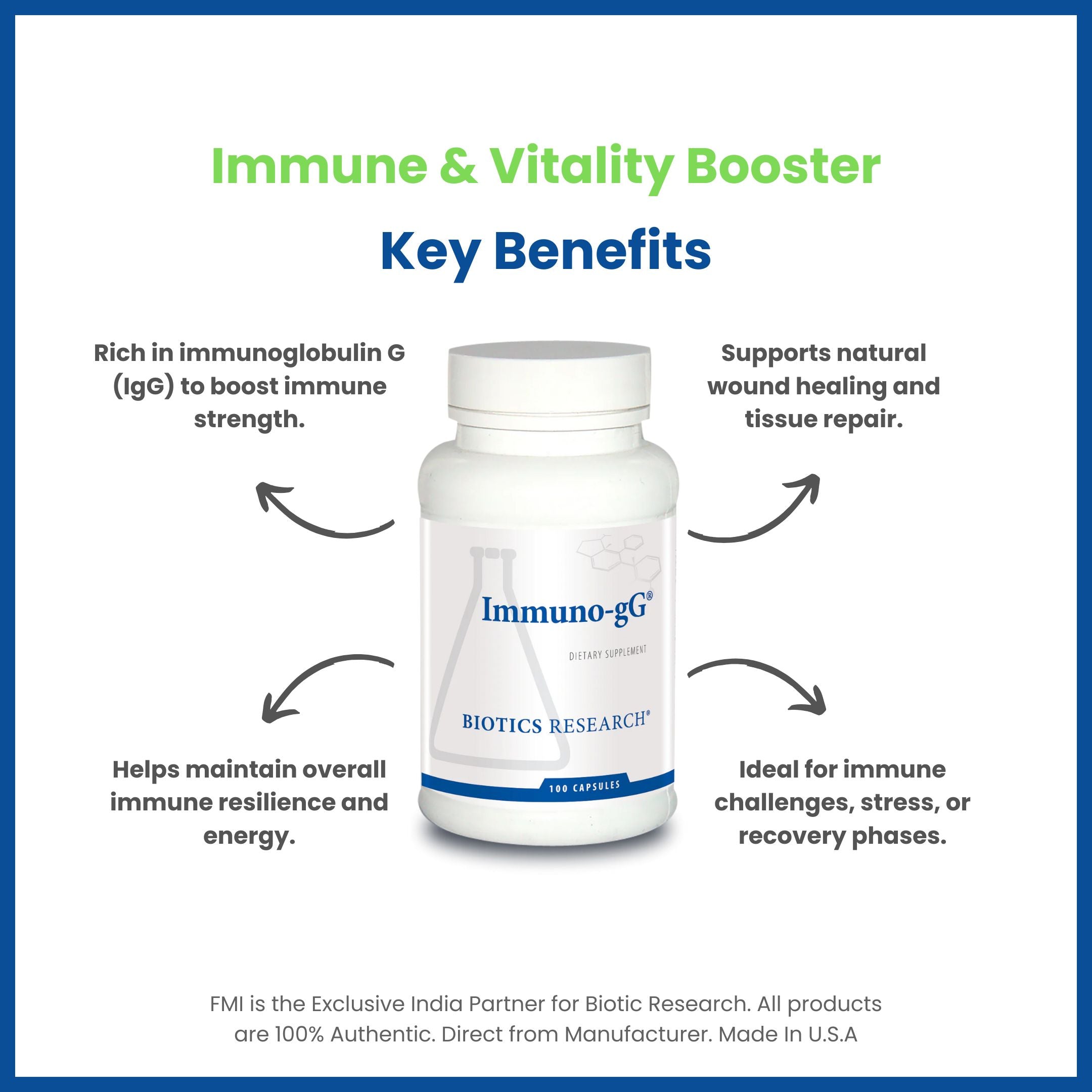 Immuno-gG offers a source of immunoglobulin G derived from bovine colostrum, enriched with the amino acids L-lysine and L-arginine. As a colostrum-based supplement, it contributes to maintaining healthy immune function by providing proteins, carbohydrates, fats, vitamins, minerals, and antibodies that support the immune system.