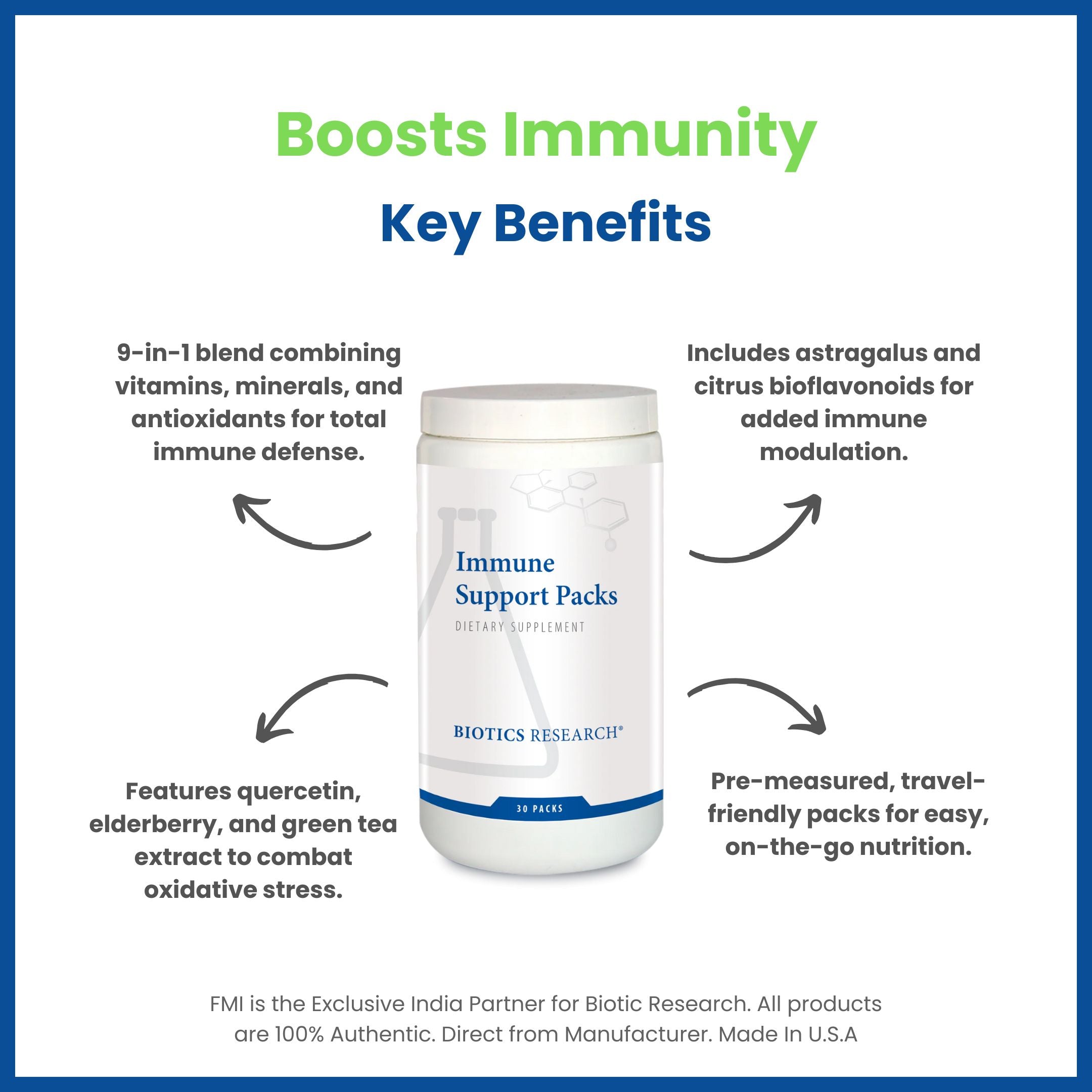 The Immune Support Packs are specially curated packs containing a comprehensive array of nutrients aimed at supporting body's natural immune response.* Each packet incorporates essential immune-supporting ingredients from nine different Biotics Research products. This 9-in-1 plus+ immune formula also features additional immune and antioxidant support through the inclusion of elderberry, green tea extract, astragalus, quercetin, and citrus bioflavonoids. For overall immune support, it is recommended to take one packet daily.