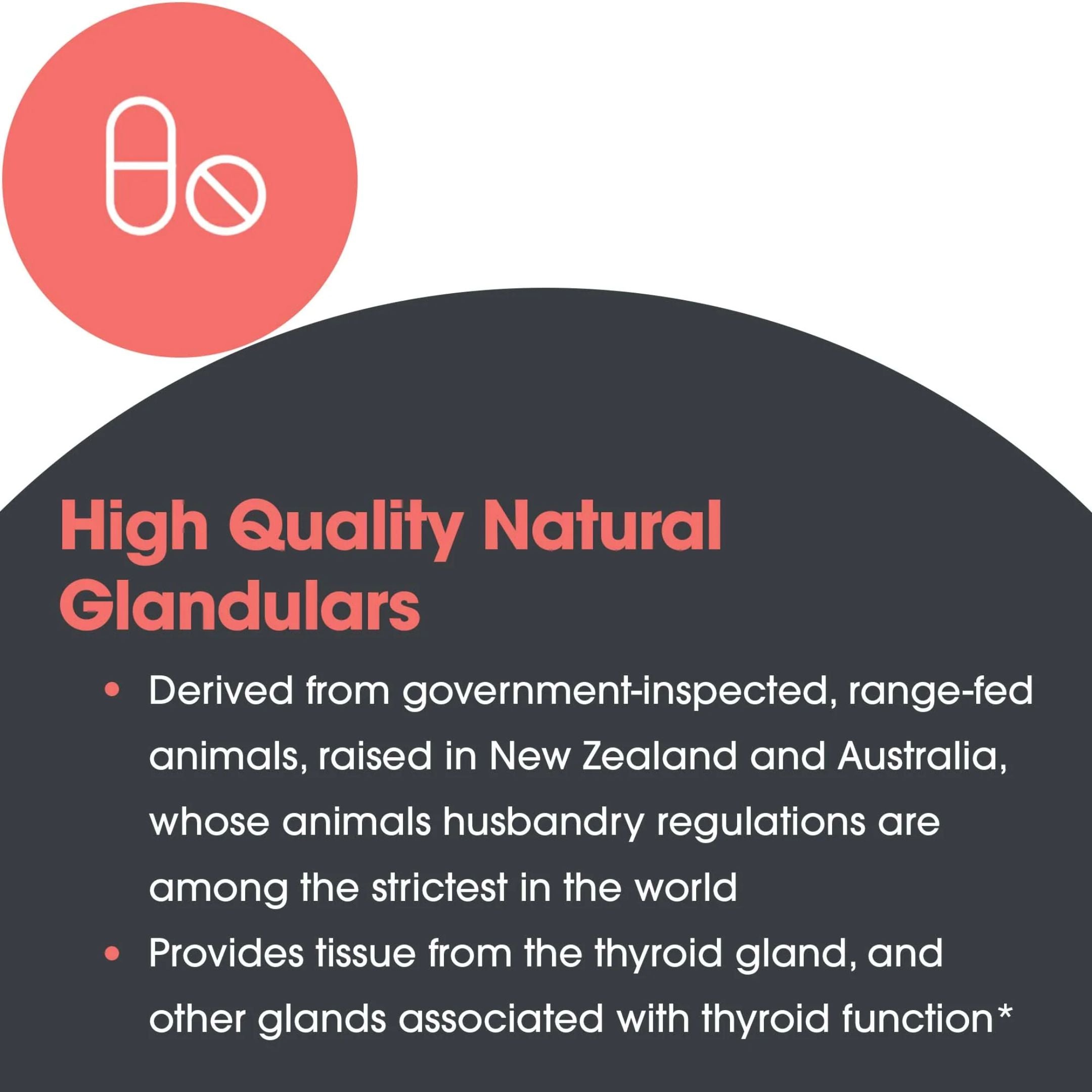 Our product provides tissue sourced from the thyroid gland and other glands associated with thyroid function. The natural glandular material is derived from government-inspected, range-fed animals raised in New Zealand and Australia, where strict animal husbandry regulations are enforced. The material undergoes a process called lyophilization, where it is immediately frozen and then subjected to a high vacuum to remove moisture directly from the solid state. This ensures the preservation of the glandular material's integrity and bioactivity.