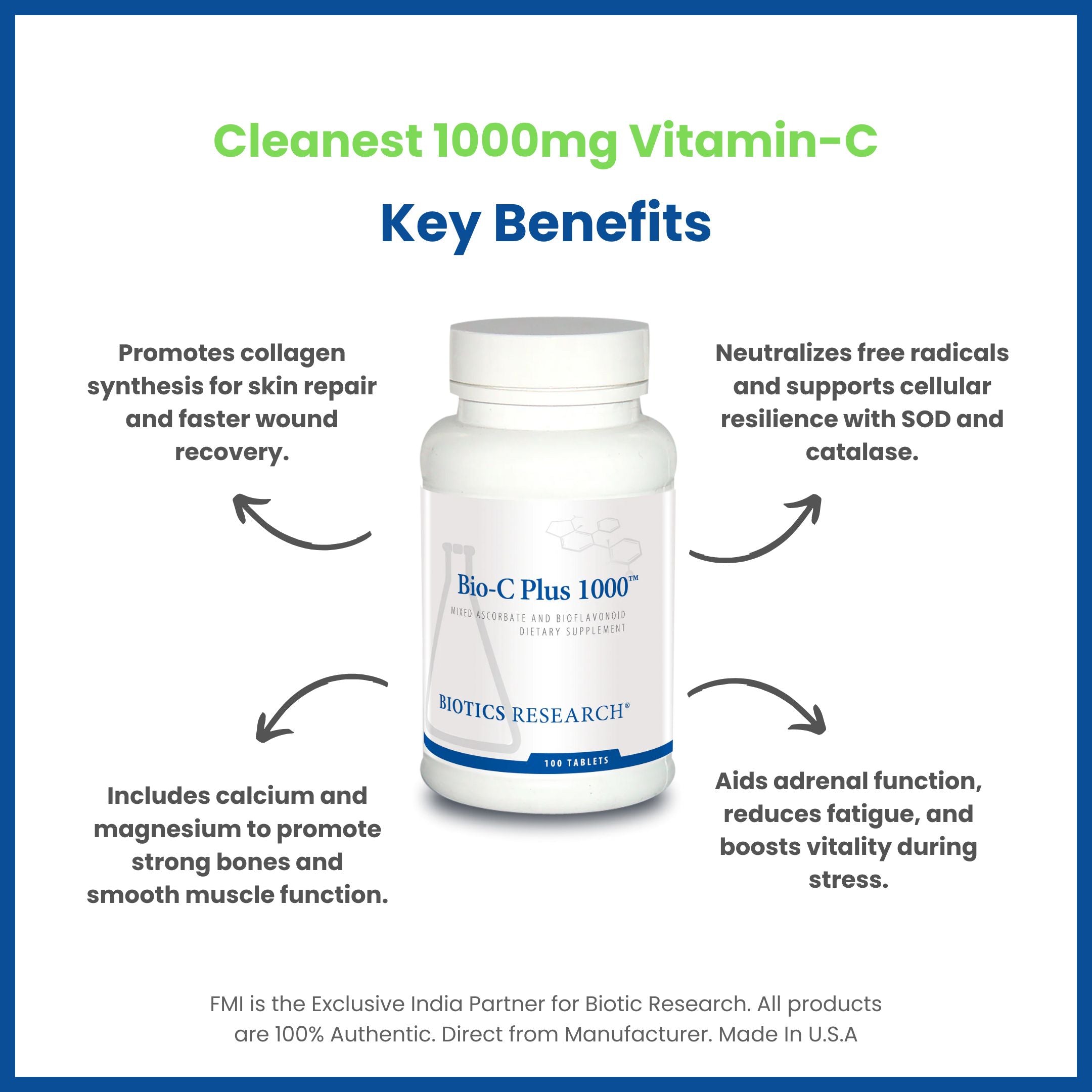 Bio-C Plus 1000 contains a blend of 1000 mg of vitamin C sourced (as calcium and magnesium ascorbates), as well as minerals such as calcium and magnesium, along with citrus bioflavonoids from citrus fruit, superoxide dismutase, and catalase sourced from vegetable culture. When taken at higher doses, mixed ascorbates like those in Bio-C Plus 1000 are less likely to cause digestive discomfort compared to pure ascorbic acid. This supplement can be beneficial whenever additional vitamin C intake is advised.