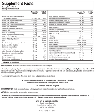 * Daily Value not established Other ingredients: Stearic acid (vegetable source), modified cellulose gum, food glaze. † Specially grown, biologically active vegetable culture (from organic peas, lentils and/or chickpeas) containing Phytochemically Bound Trace Elements™ and naturally associated phytochemicals including polyphenolic including polyphenolic compounds with SOD and catalase, dehydrated at low temperature to preserve associated enzyme factors. †† A unique proprietary complex of neonatal bovine tissue and porcine tissue concentrates. ‡ FRAC® (a registered trademark of Biotics Research Corporation) is a mixture of free transferulic acid and free sterols prepared from rice bran. This product is gluten and dairy free. Recommendation: Six (6) tablets each day as a dietary supplement or as otherwise directed by a healthcare professional. Caution: Not recommended for pregnant or lactating women. WARNING: Accidental overdose of iron-containing products is a leading cause of poisoning in children under 6. Keep this product out of reach of children. In case of accidental overdose, call a doctor or poison control center immediately. KEEP OUT OF REACH OF CHILDREN Store in a cool and dry area. |