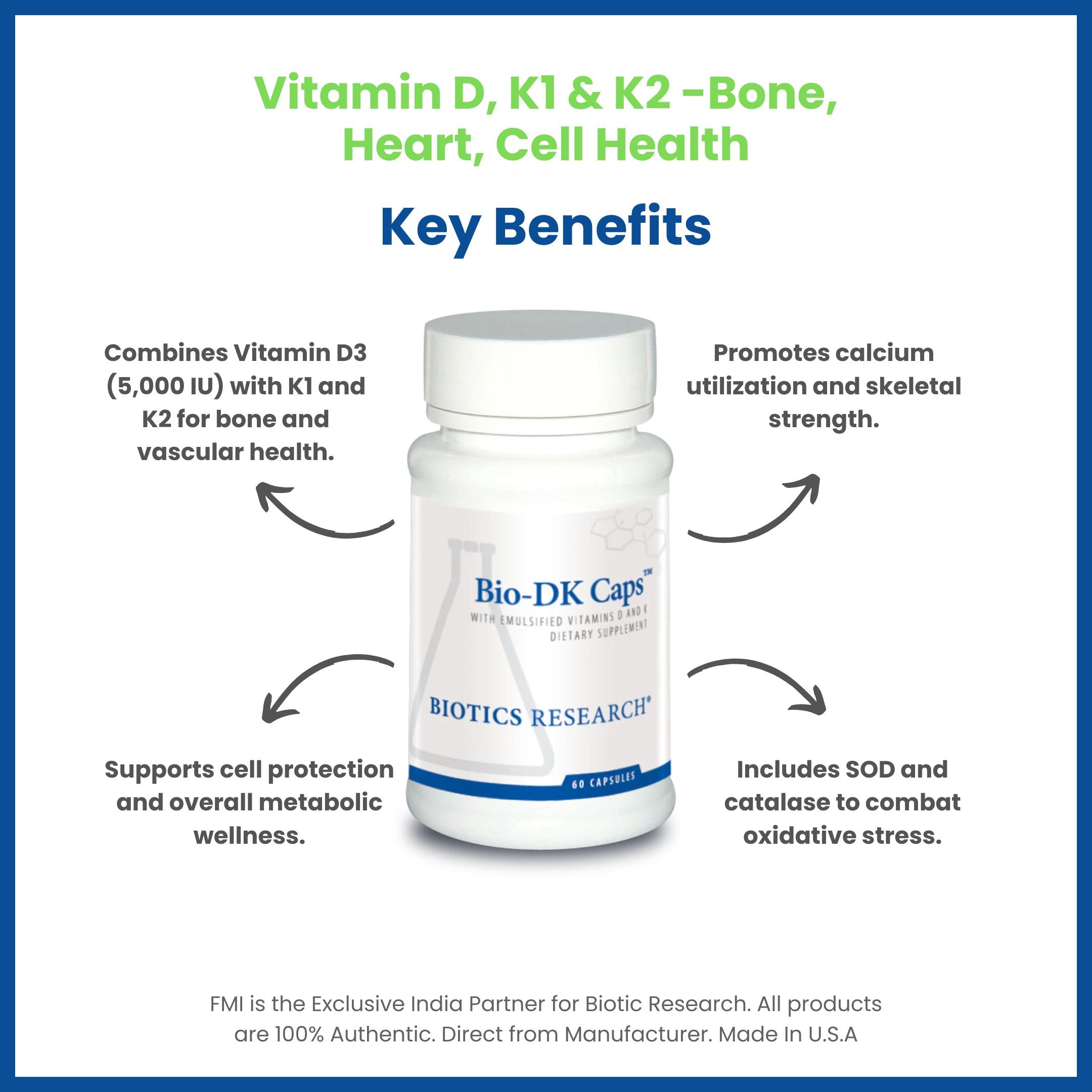 Beyond the emulsified vitamins D and K, Bio-DK Caps incorporates the enzymes superoxide dismutase (SOD) and catalase. SOD plays a crucial role in cell repair and offers protection against cellular damage caused by free radicals and environmental toxins.
