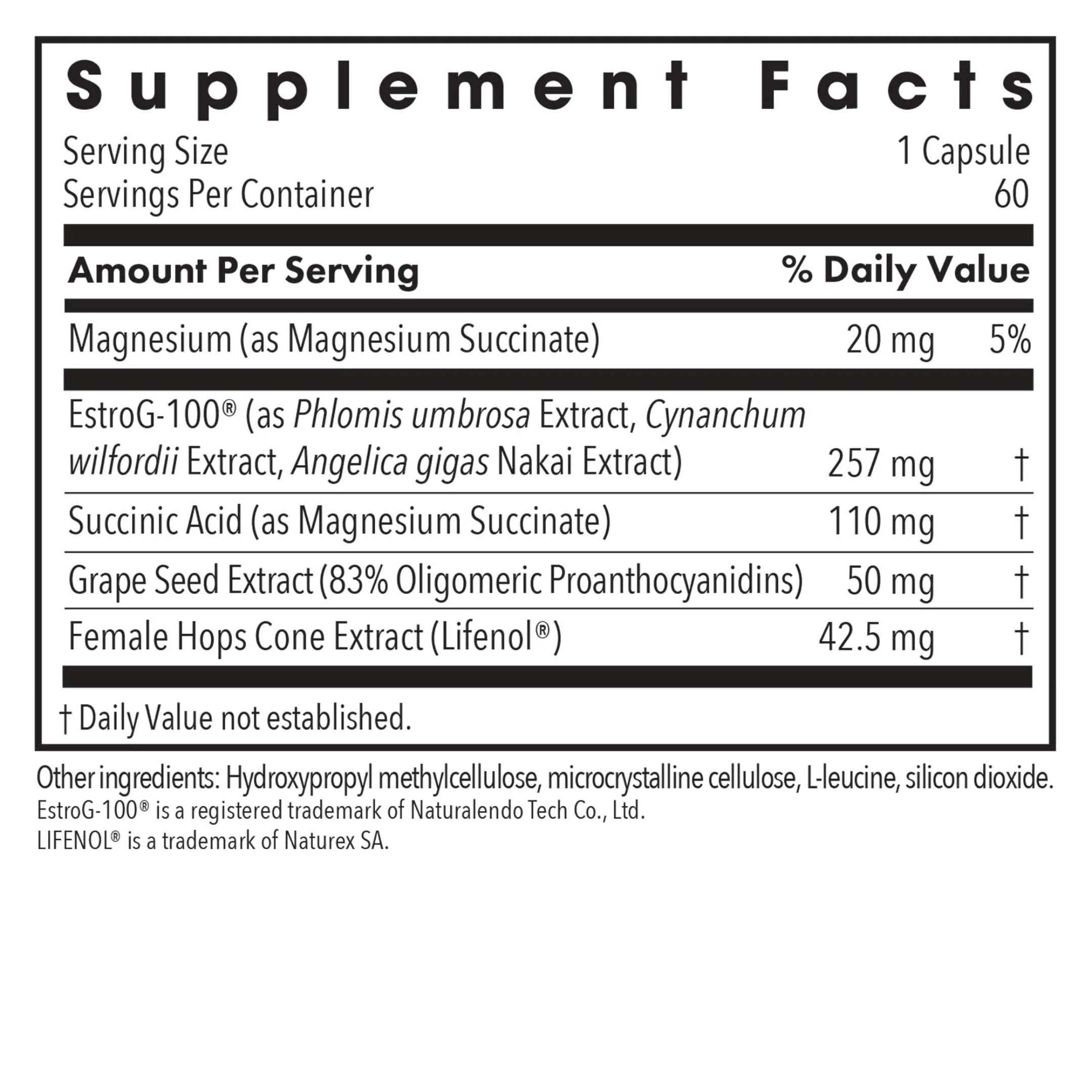 | EstroG-100® (as Phlomis umbrosa Extract, Cynanchum wilfordii Extract, Angelica gigas Nakai Extract) | 257 mg | † |