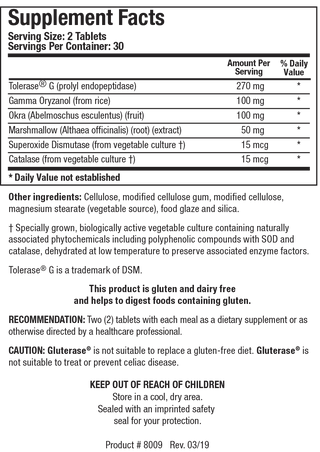 * Daily Value not established Other Ingredients: Cellulose, modified cellulose gum, modified cellulose, magnesium stearate (vegetable source), food glaze and silica. †Specially grown, biologically active vegetable culture containing naturally associated phytochemicals including polyphenolic compounds with SOD and catalase, dehydrated at low temperature to preserve associated enzyme factors. Tolerase®G is a trademark of DSM. This product is gluten and dairy free. It helps to digest foods containing gluten. Recommendation: One (1) tablet each day as a dietary supplement or as otherwise directed by a healthcare professional. Note: Gluterase is not suitable to replace a gluten-free diet. Gluterase is not suitable to treat or prevent celiac disease. Caution: Pregnant or lactating women should consult with their physician prior to use. Avoid in patients taking monoamine oxidase inhibitors and herbs or supplements with serotonergic properties, or those with Parkinson’s disease. KEEP OUT OF REACH OF CHILDREN Store in a cool & dry area. | ||
