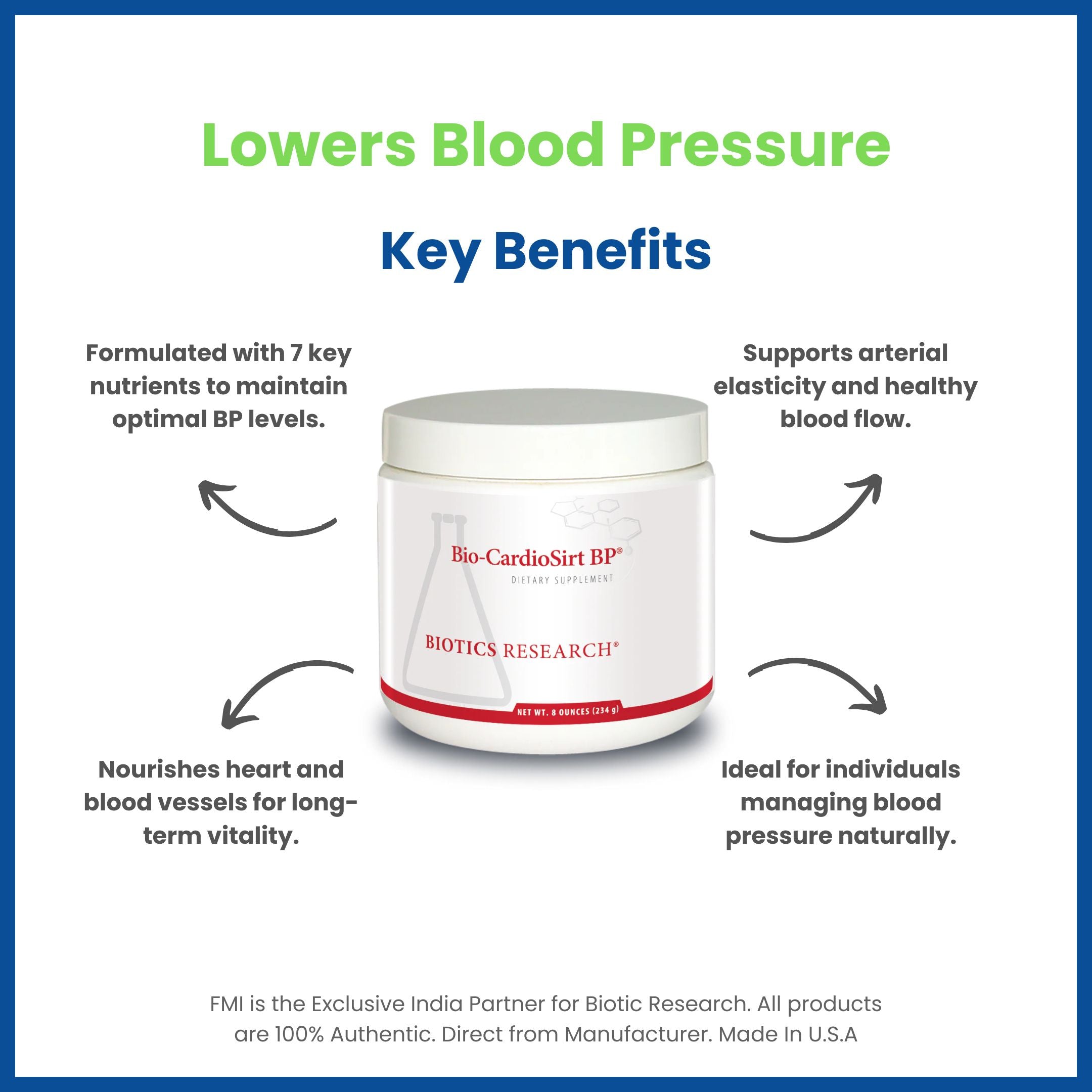 Bio-CardioSirt BP (patent-pending formulation) presents an exclusive blend of 7 essential micronutrients designed to support normal and healthy blood pressure levels.* The synergistic combination features vitamins C, D, and B6, complemented by biotin, magnesium, taurine, and grape seed extract.