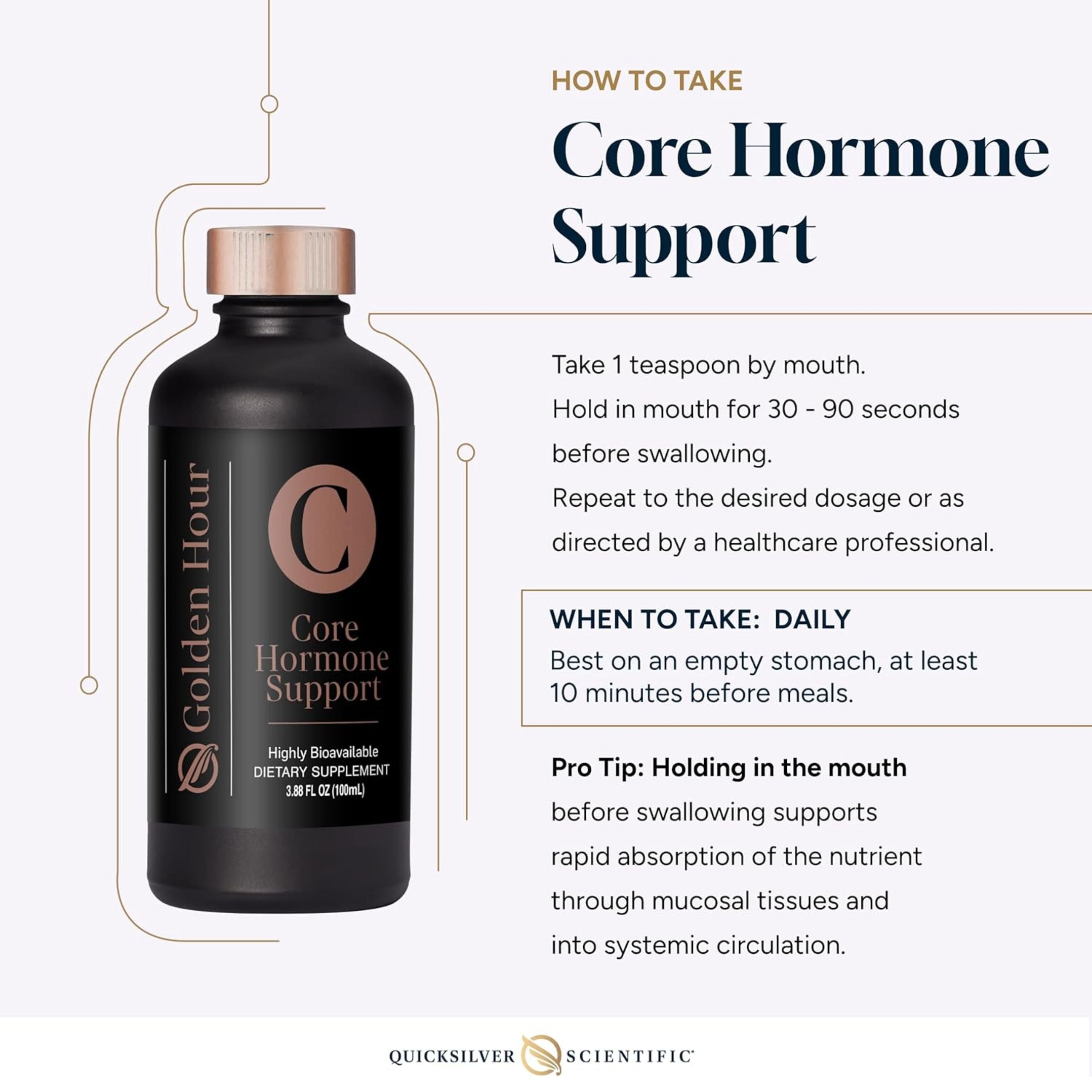 Suggested Use: Take 1 teaspoon by mouth. Hold in mouth 30 - 90 seconds before swallowing. Repeat to desired dosage or as directed by a heathcare practitioner. Best taken on an empty stomach at least 10 minutes before meals.