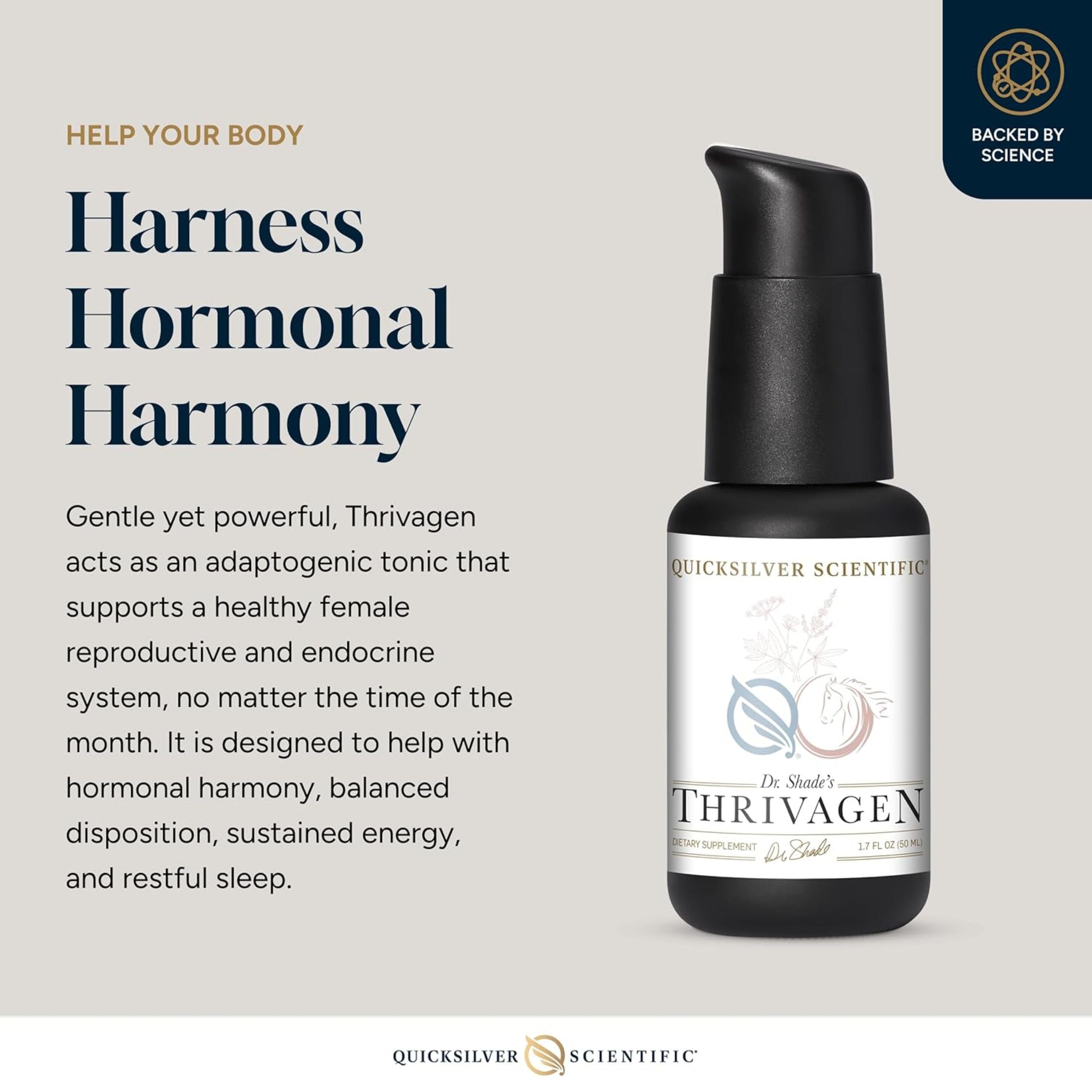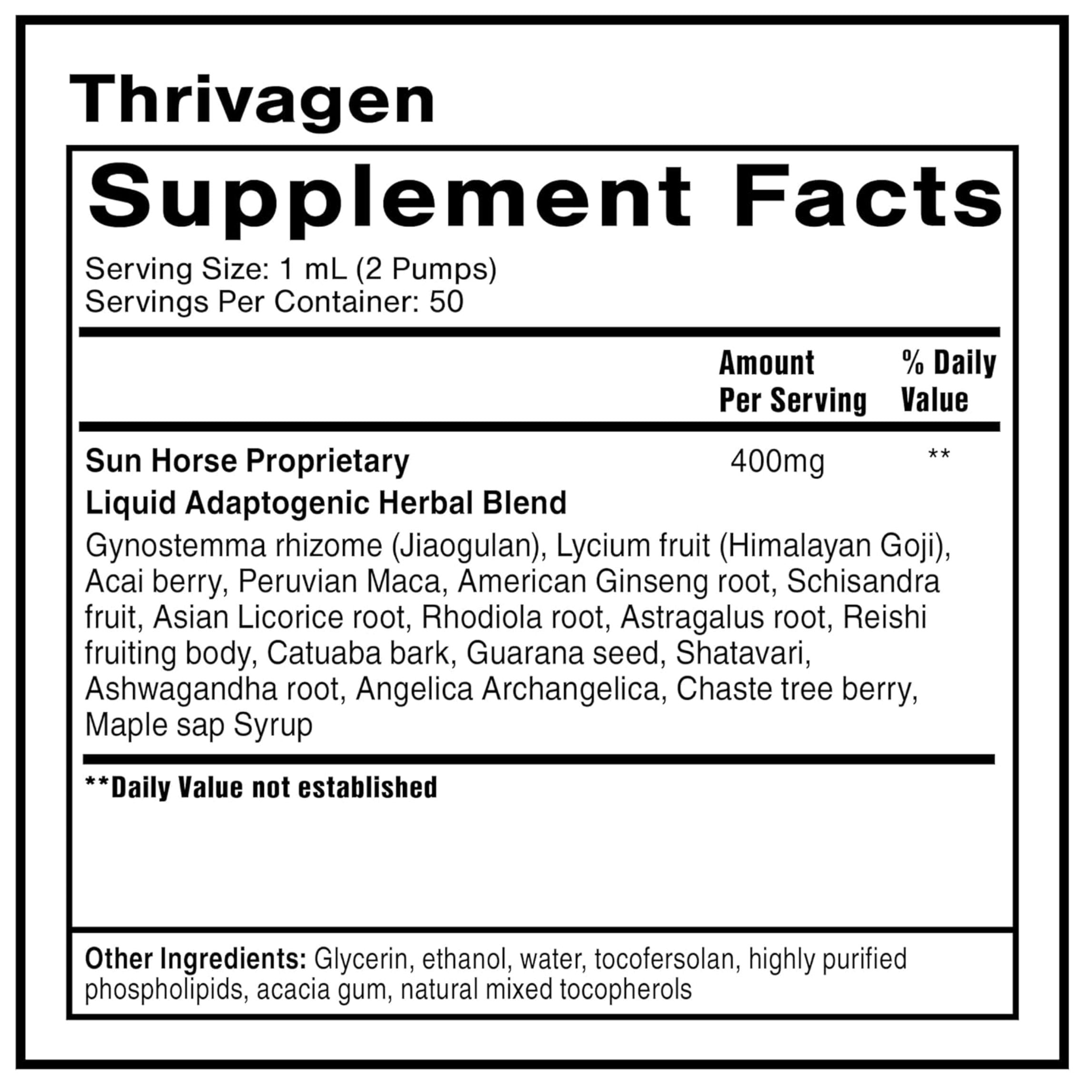 Unlike standard herbal blends, Thrivagen® combines female-specific adaptogens with advanced liposomal technology for unsurpassed bioavailability.* Ashwagandha, rhodiola, and Chinese licorice support stress resilience and cortisol balance, while chaste tree berry, shatavari, and angelica harmonize female hormones across life stages.* Maca adds energy-enhancing properties, and the liposomal format ensures rapid absorption and therapeutic impact. Thrivagen® is vegan, gluten-free, non-GMO, sugar-free, and soy-protein free, making it a clean and accessible solution for women’s wellness.*