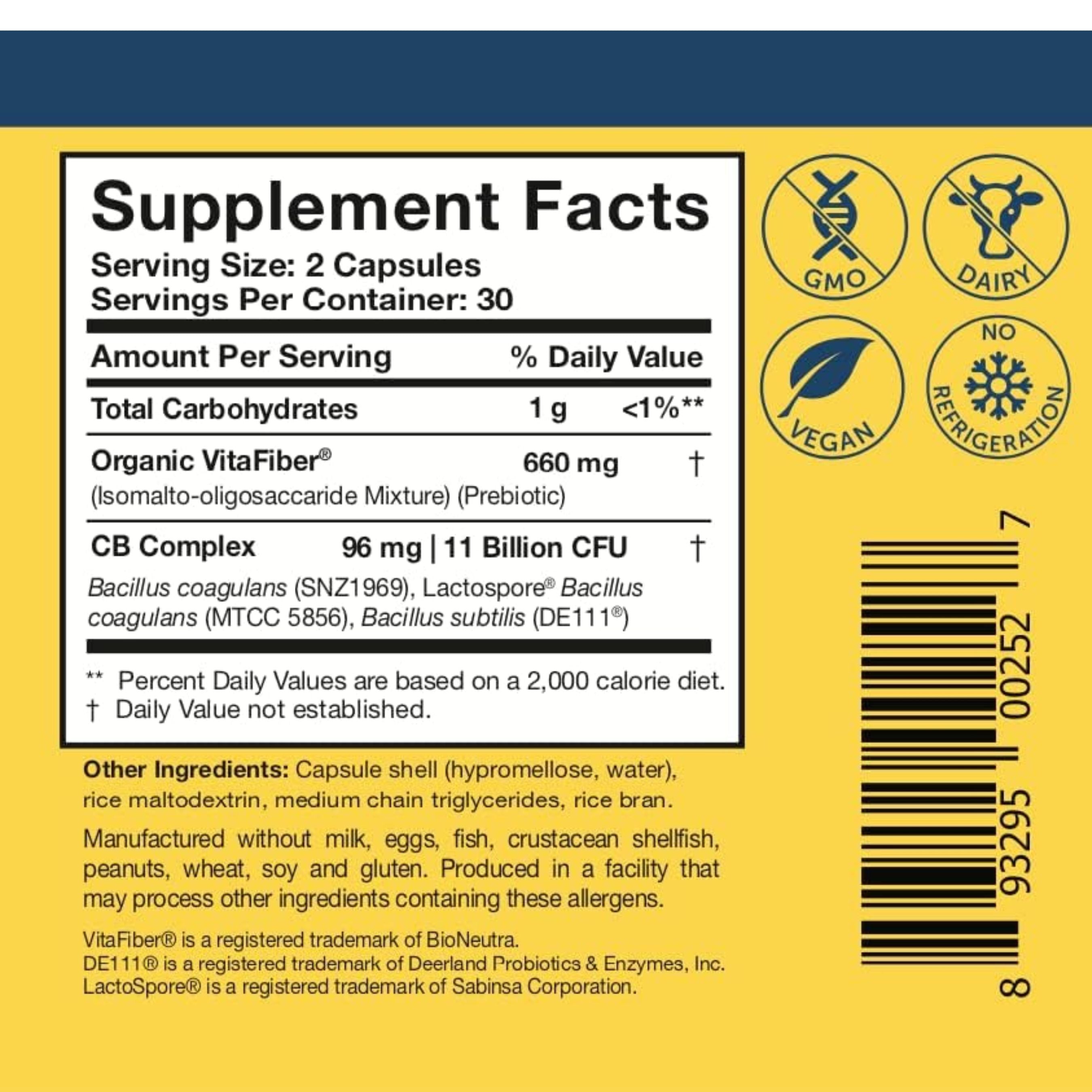 - Three spore-based probiotic strains + VitaFiber® prebiotic† - 11 billion CFU per dose