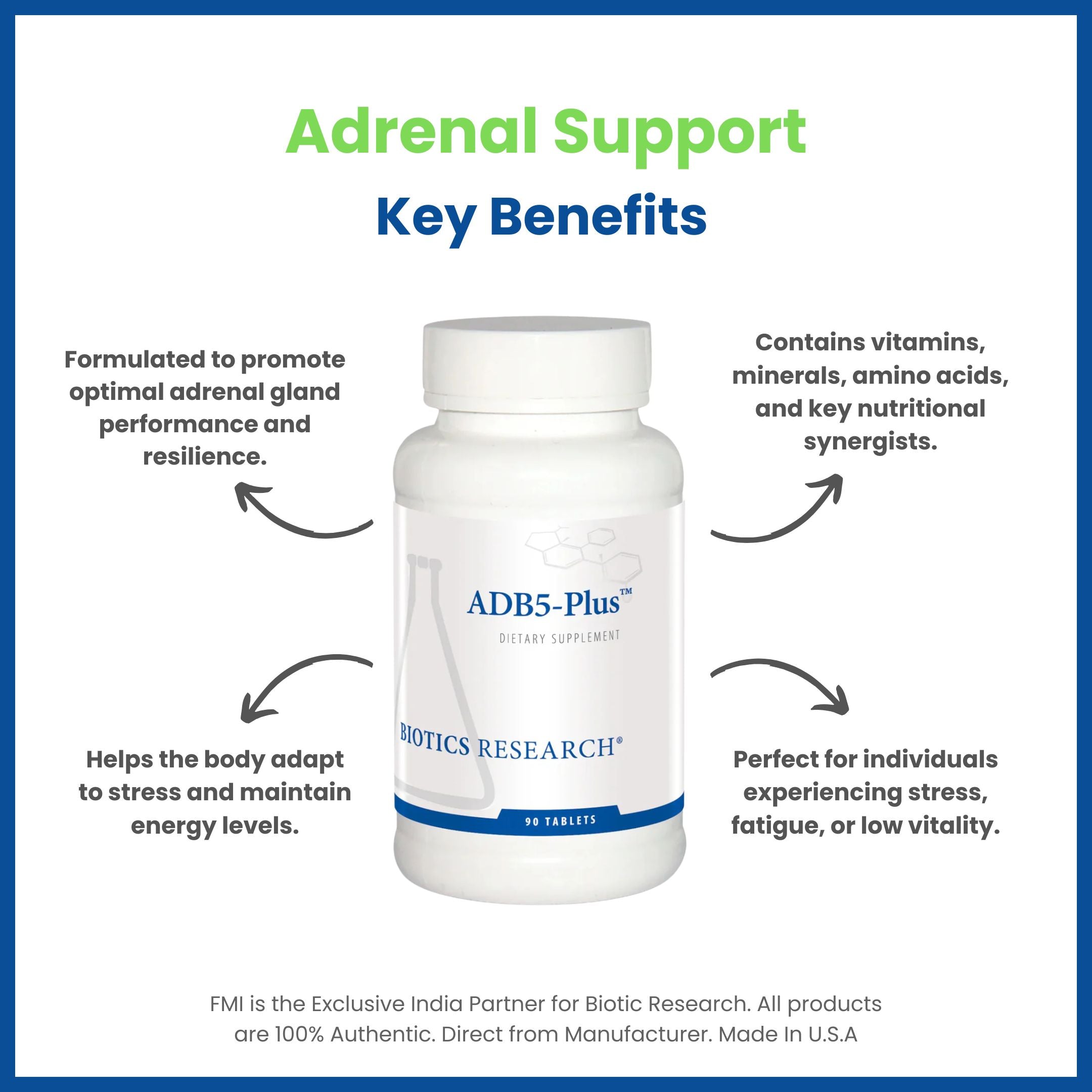 ADB5-Plus is a unique combination of vitamins, minerals, amino acids, and other essential nutritional synergists formulated to promote healthy adrenal function. This product incorporates glandular extracts such as adrenal gland concentrate (from porcine), lamb pituitary/hypothalamus complex (from ovine), and parotid tissue (from bovine). These glandular components supply raw materials and essential chemical messengers that support the functional health of the adrenals.