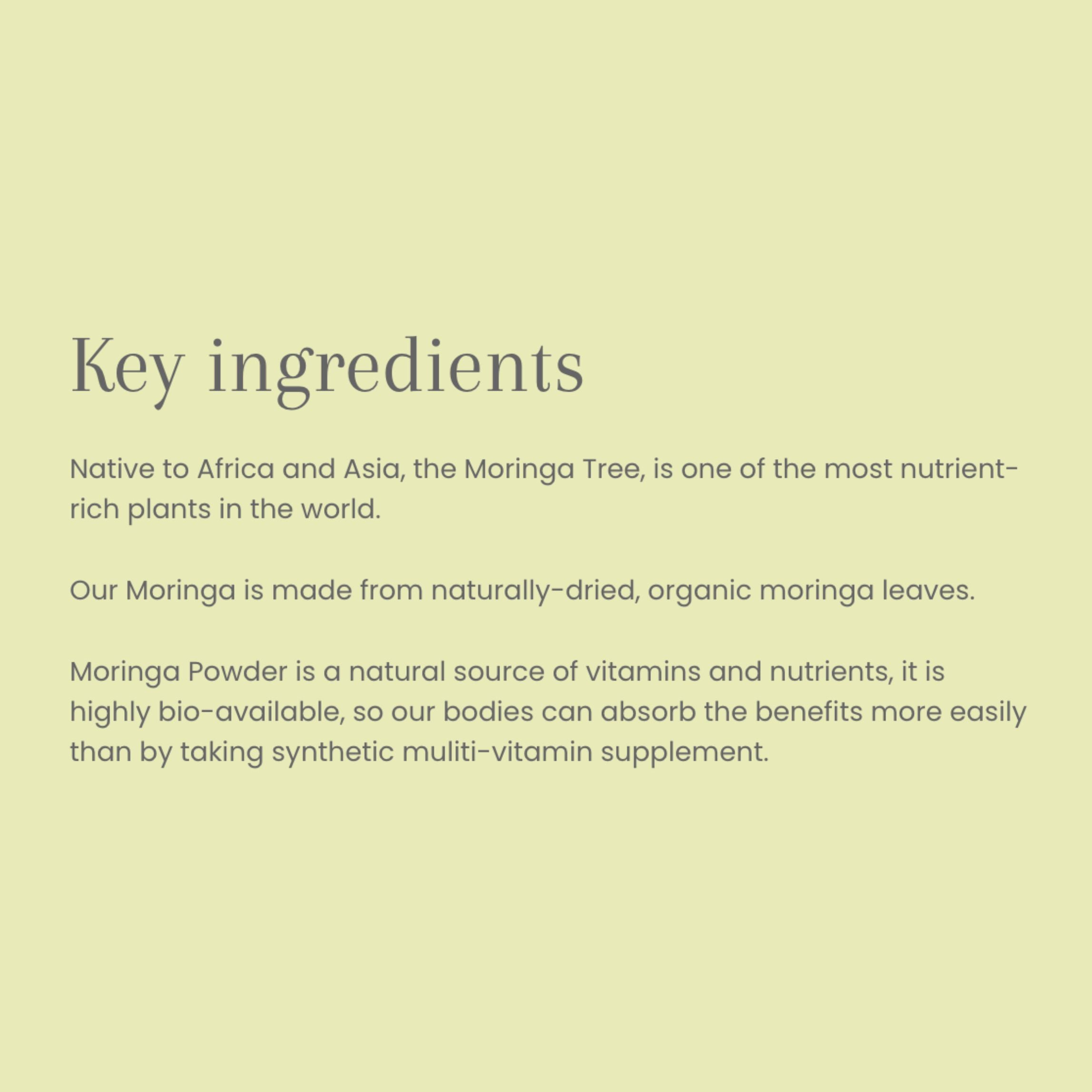 ORGANIC: Made using all Natural Plant Nutrients, delivers 500mg of Organic Moringa Leaf (Moringa Oleifera).