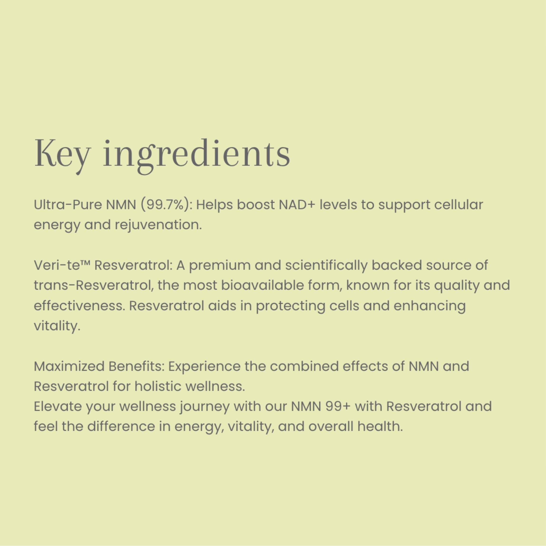Unlock the future of cellular health with our NMN 99+ with Resveratrol, a powerful blend designed to support vitality, longevity, and cellular energy at the highest level of purity. Tested at an impressive 99.7% purity, our NMN is among the purest on the market, helping to elevate NAD+ levels naturally and support your body’s energy production, cognitive function, and resilience against aging.