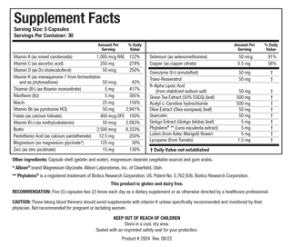 * Daily Value not established Other Ingredients: Capsule shell (gelatin and water), magnesium stearate (vegetable source) and gum arabic. *Albion® brand Magnesium Glycinate. Albion laboratories, Inc. of Clearfield, Utah. **Phytolens® is a registered trademark of Biotics Research Corporation. US. Patent No. 5,762,936, Biotics Research Corporation . This product is gluten and dairy free. Recommendation: Five (5) capsules two (2) times each day as a dietary supplement or as otherwise directed by a healthcare professional. Caution: Those taking Coumandin or anticoagulants should avoid supplements with vitamin K unless specifically recommended and monitored by their physician. Not recommended for pregnant or lactating women. KEEP OUT OF REACH OF CHILDREN. Store in a cool & dry area. |