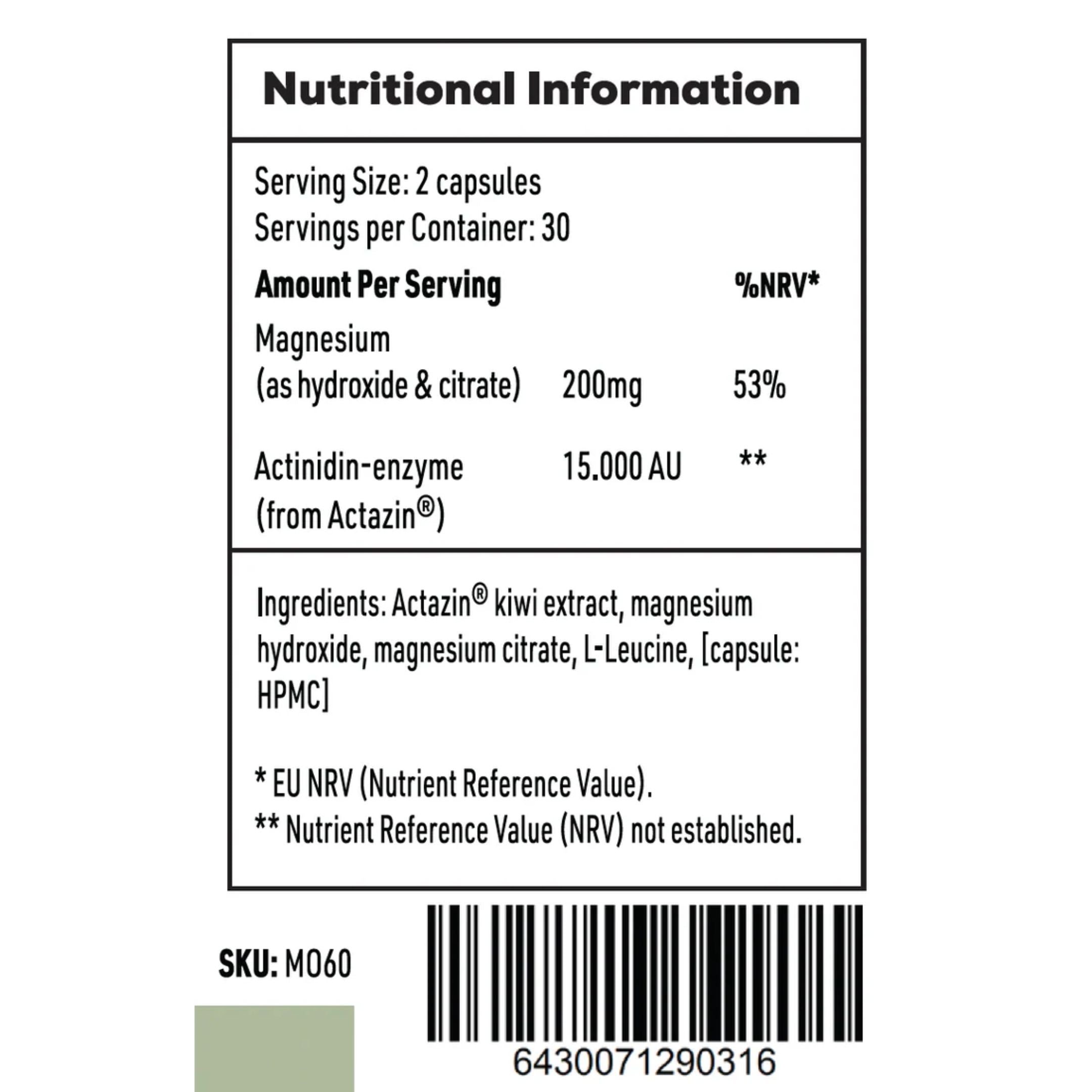*EU NRV (Nutrient Reference Value) ** Nutrient Reference Value (NRV) not established. Ingredients: Magnesium hydroxide, magnesium citrate, Kiwi fruit extract (Actazin), L-Leucine, HPMC (Capsule) |